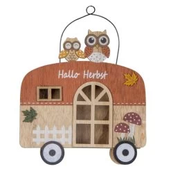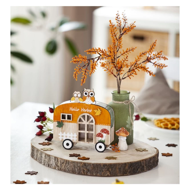 All diejenigen Trendsetter, die die goldenen Monate mithilfe herbstlicher Dekoration willkommen heißen und überdies persönliche Akzente in den heimischen vier Wänden setzen möchten, kommen mit dem tollen Dekohänger vollends auf ihre Kosten! Dieser kommt in Form eines liebevoll gestalteten Wohnwagens daher, welcher sich hervorragend dazu eignet, um die Fantasie beim Schmücken frei walten zu lassen. Er besteht aus Holz, misst ca. 18 x 5 x 19,5 cm und zieht mithilfe der liebenswerten Eulen sowie der herbstlichen Pilze mit Leichtigkeit alle Blicke auf sich. Ganz gleich, ob an einer geeigneten Stelle aufgehängt oder liebevoll auf dem Tisch oder Regal in Szene gesetzt – mit dem niedlichen Deko-Wohnwagen bleiben fortan keinerlei Wünsche mehr offen. Also schnappt ihn euch und erlebt grenzenlosen Dekospaß!