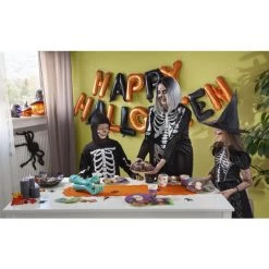 Gruselfans, aufgepasst! Wenn ihr auf der Suche nach eindrucksvoller Halloweendekoration seid, mit der ihr eurer Fantasie freien Lauf und die Feierlichkeiten stilecht einläuten könnt, liegt ihr mit dem lustigen Folienballon goldrichtig! Dieser ist nämlich das ideale Stück, um das Zuhause in Sekundenschnelle in eine heitere Partystimmung zu tauchen und mühelos halloweenische Akzente darin zu setzen. Er besteht aus robuster Folie, ist insgesamt 40 cm groß und für das Befüllen mit Helium (nicht im Lieferumfang enthalten) geeignet. Darüber hinaus werden sieben Meter Befestigungsseil mitgeliefert, mihilfe dessen ihr den Ballon nach Belieben an die von euch gewünschte Stelle hängen könnt. Aus diesem Grund eignet sich der tolle Luftballon hervorragend für jeden Halloweenfan und solche, die dem Zuhause an Halloween gerne eine persönliche Note verleihen möchten.