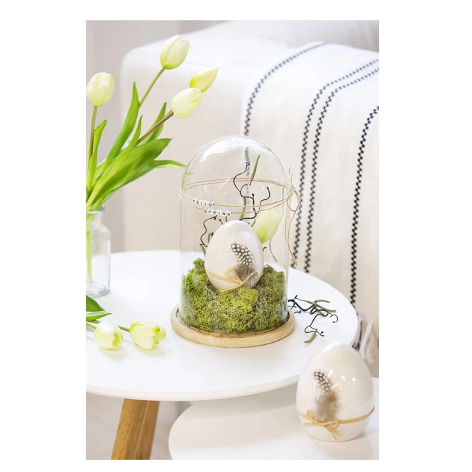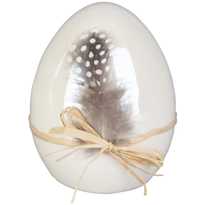 Man kann sie färben, ausblasen und bemalen: Eier. Mit ihnen ergeben sich nicht nur zahlreiche Gestaltungsmöglichkeiten, sondern sie sind neben Hasen auch das Ostersymbol schlechthin. Wenn Sie auf der Suche nach einem echten Prachtexemplar sind, mit dem Ihrer Fantasie beim frühjährlichen Schmücken keinerlei Grenzen gesetzt sind, liegen Sie mit dem niedlichen Osterei goldrichtig! Dieses eignet sich nämlich ideal, um mit Leichtigkeit eine österliche Atmosphäre in den vier Wänden aufkommen zu lassen. Es besteht aus glänzendem Keramik, ist in verschiedenen Größen erhältlich und insbesondere dank der Schleife sowie den zarten Federn der absolute Augenschmaus, der Dekoherzen im Nu höherschlagen lässt. Mit ihm können Sie Ihrer Kreativität in der Knospen sprießenden Jahreszeit freien Lauf lassen und das Zuhause mühelos in eine behagliche Wohlfühloase verwandeln. Also schnappen Sie sich das hinreißende Deko-Ei und legen Sie gleich los!