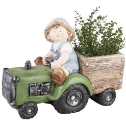 Mit dem tollen Pflanzgefäß erhalten Hobbygärtner und -gärtnerinnen von nun an die Gelegenheit, ihre Gewächse auf besonders dekorative Weise zur Schau zu stellen. Es besteht aus robustem Magnesia, ist 47 x 18 x 35 cm groß und insbesondere dank dem außergewöhnlichen Design ein stilvoller Blickfang, der nicht nur echte Trendsetter begeistert. Dieses kommt in Form eines Jungens daher, welcher auf einem Traktor sitzt, dessen Anhänger als Planztopf fungiert. Das niedliche Kerlchen weist ganz standesgemäß Latzhose sowie Sonnenhut auf und zaubert dem einen oder anderen durch sein schelmisches Grinsen garantiert ein großes Lächeln auf die Lippen. Dadurch sind Pflanzen jederzeit bestens bewacht, während der Topf gleichzeitig das trendige Highlight eines jeden Zuhauses ist. Darüber hinaus ist er auch ein tolles Stück für all diejenigen, die Wert auf eine moderne Dekoration legen.