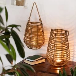 Trendsetter, aufgepasst! Wenn ihr nicht genug von modernen Stücken bekommt, die alles andere als langweilig, sondern echte Hingucker sind, werdet ihr das niedliche Windlicht lieben! Dieses ist nämlich genau das Richtige, um die Fantasie beim Dekorieren frei walten zu lassen und sich binnen Sekunden eine behagliche Wohlfühloase zu schaffen. Es besteht aus Rattan, ist in zwei verschiedenen Größen erhältlich und insbesondere aufgrund des aus Kordel bestehenden Henkels ein dekoratives Highlight, das sich nahtlos in jeden Raum einfügt. Darüber hinaus ist es mit einem gläsernen Einsatz ausgestattet, in dem ihr jederzeit ein Teelicht entzünden (nicht im Lieferumfang enthalten) und euch am wohligen Flackern des Kerzenscheins erfreuen könnt. Also schnappt euch die tolle Laterne und erlebt grenzenlosen Dekospaß!